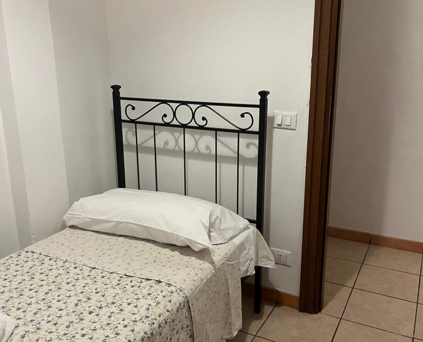 Salendo le scale interne si arriva all’ingresso della zona notte, che si snoda attraverso il bagno completo di doccia e tendina, la cameretta con un letto singolo e un appendiabiti mobile e la camera grande con 2 letti singoli (unibili) con ampio armadio.